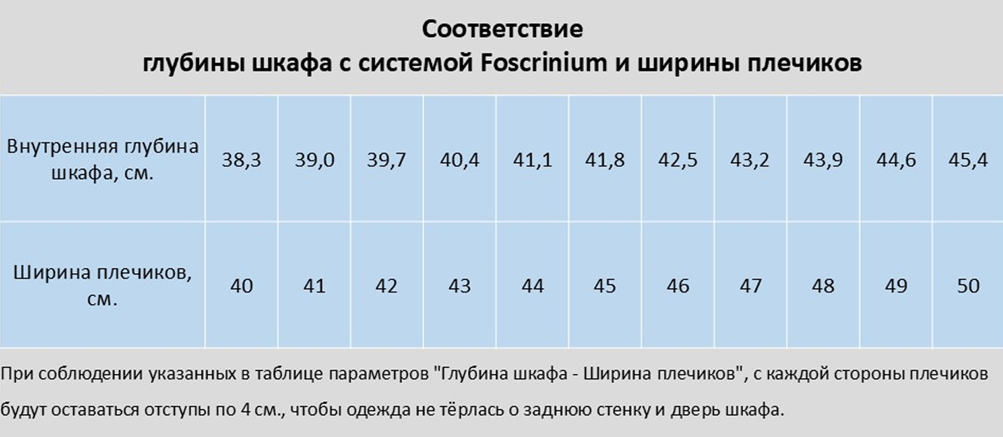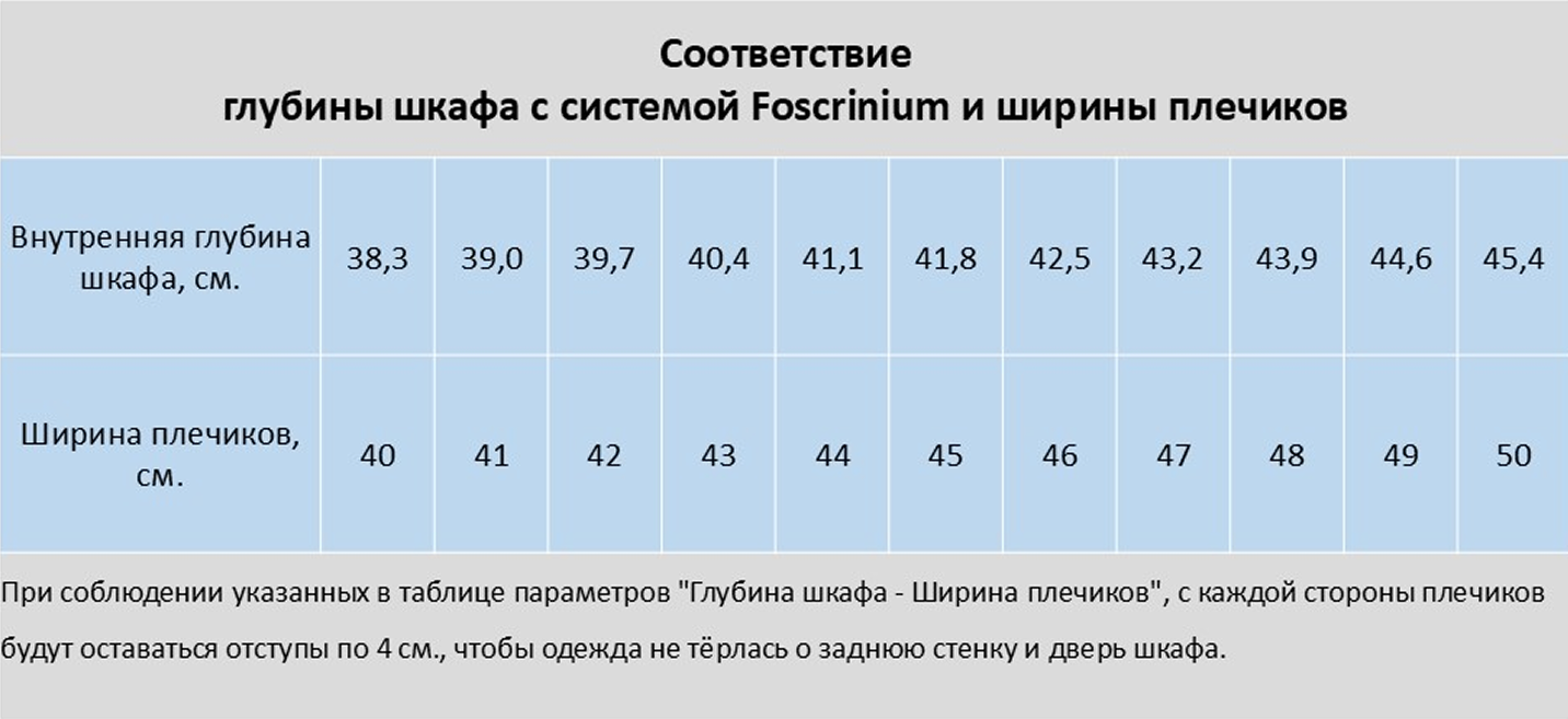 2.В шкаф можно установить обычную продольную штангу с накладкой Foscrinium. С учётом незадействованного пространства с левого (13 см.) и правого (13 см.) концов, полезная глубина составляет 34 см., что больше, чем у поперечной выдвижной штанги. При увеличении ширины отделения на 5−10−15−20 см. и неизменной глубине в 40 см., полезная длина штанги с накладкой составит 39−44−49−54 см. соответственно. Незадействованное пространство по краям при этом можно использовать для узких детских плечиков, вешалок для брюк, ремней, шарфов, палантинов, а также зонтов и других предметов гардероба.